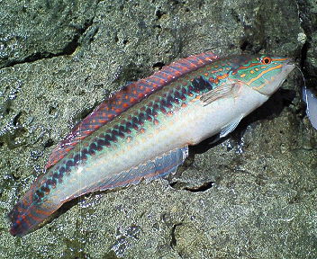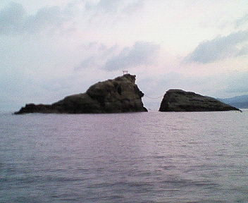 人が来ているのに閑散としています。聞いたら、客は自分達だけだそう です。 この港にはもう一艘「佐市丸」という渡船がありますが、そちらはお客 なし = どこの磯でも乗り放題という夢のような状況 → こんな日に 釣りに来るのは熱中症で死んでもいいバカだけ?・・・。 ここまで来て釣らずには帰れないということで、5時に船で出発し、長 島という磯に降ろしてもらいました。朝のうちはまだ良かったのですが、 日が昇ったら猛烈な暑さで、追い打ちをかけるようにハンマーヘッド(シ ュモクザメ)が島の周りをウロウロし、ウミガメまでやってきて魚の気配 はなくなり、メゲそうになりました。 9時過ぎに船長が様子を見に来てくれたので、そそくさと磯替えしました。 次に降ろしてもらったのは、地続きの崖の下です。ここは、午前中は