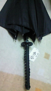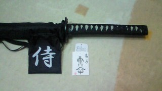 日本刀の柄が持ち手になっている傘 「サムライアンブレラ」とか 「かさな」とか、色々種類が ありますが、購入したのは (株)東山堂CHAMPの通販で 「名刀 雨傘」 というものです。 夏用の剣道着を買うついでに 買っちゃいました。 6,000円もしました。 鮫皮ではなくプラスチックの柄に 柄巻が普通に巻いてあります。 傘の部分は70cmなので、 定寸(2尺3寸)サイズです。 持ち歩くための肩掛け式の傘袋(鞘) とその傘袋を入れる小袋が付いていて、 小袋にはご丁寧に「侍」と印刷する 念の入れようです。 傘でありながら、太刀の手の内を 勉強できます。 でも、傘でゴルフスイングをしている 人のように、切るマネとかしていたら、 しょっ引かれそうですが(笑) 生憎、今日は天気でしたが、 まだ暫くは梅雨空が 続きますので、持ち歩くのが楽しみです。 家族からは、すっかり変な人という目で 見られていますが、全然平気です。 電車とか飲み屋で忘れないようにしないと。